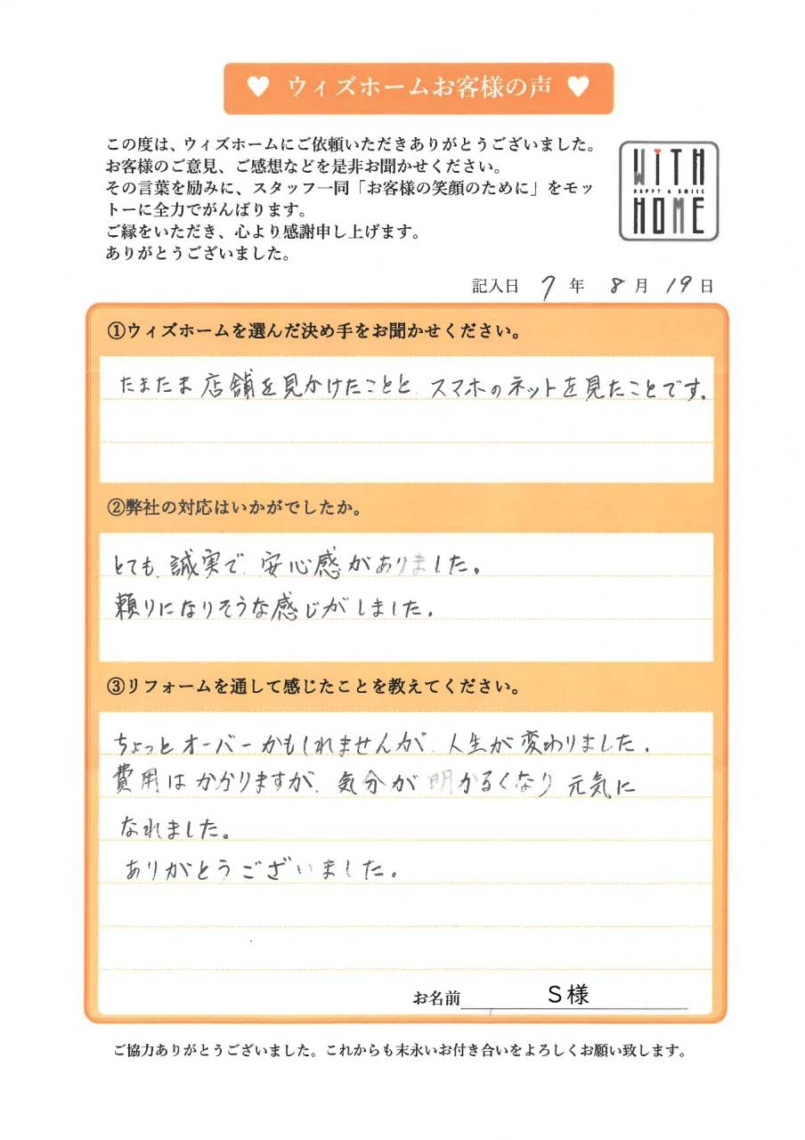 洗面台を施工させていただいたS様から感想を頂きました。