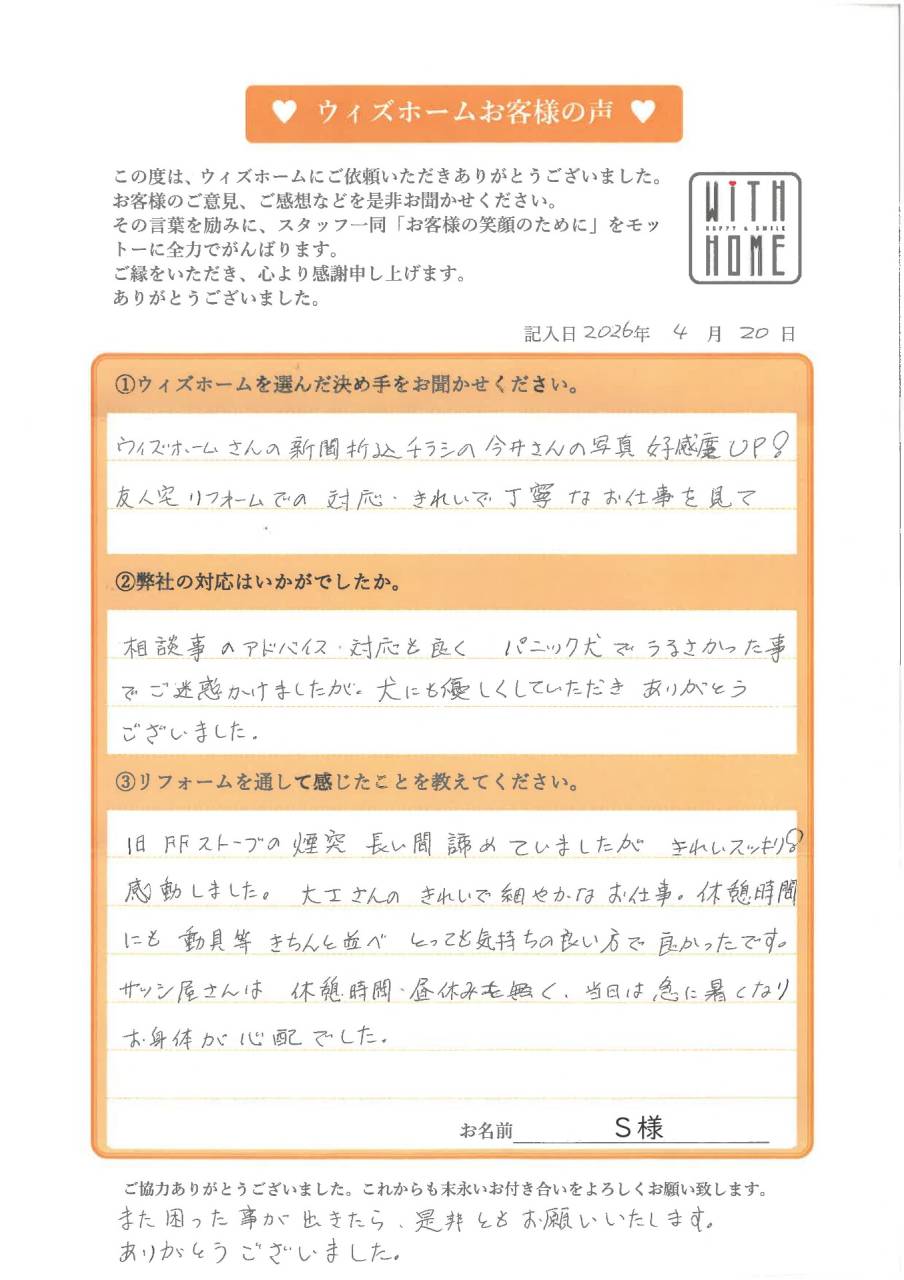 内装、玄関、窓、雨戸などをリフォームさせていただいた、江南市のS様から感想をいただきました。